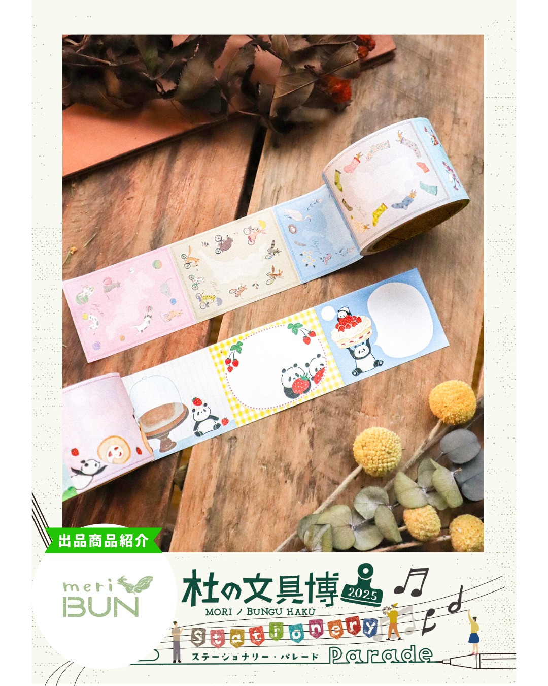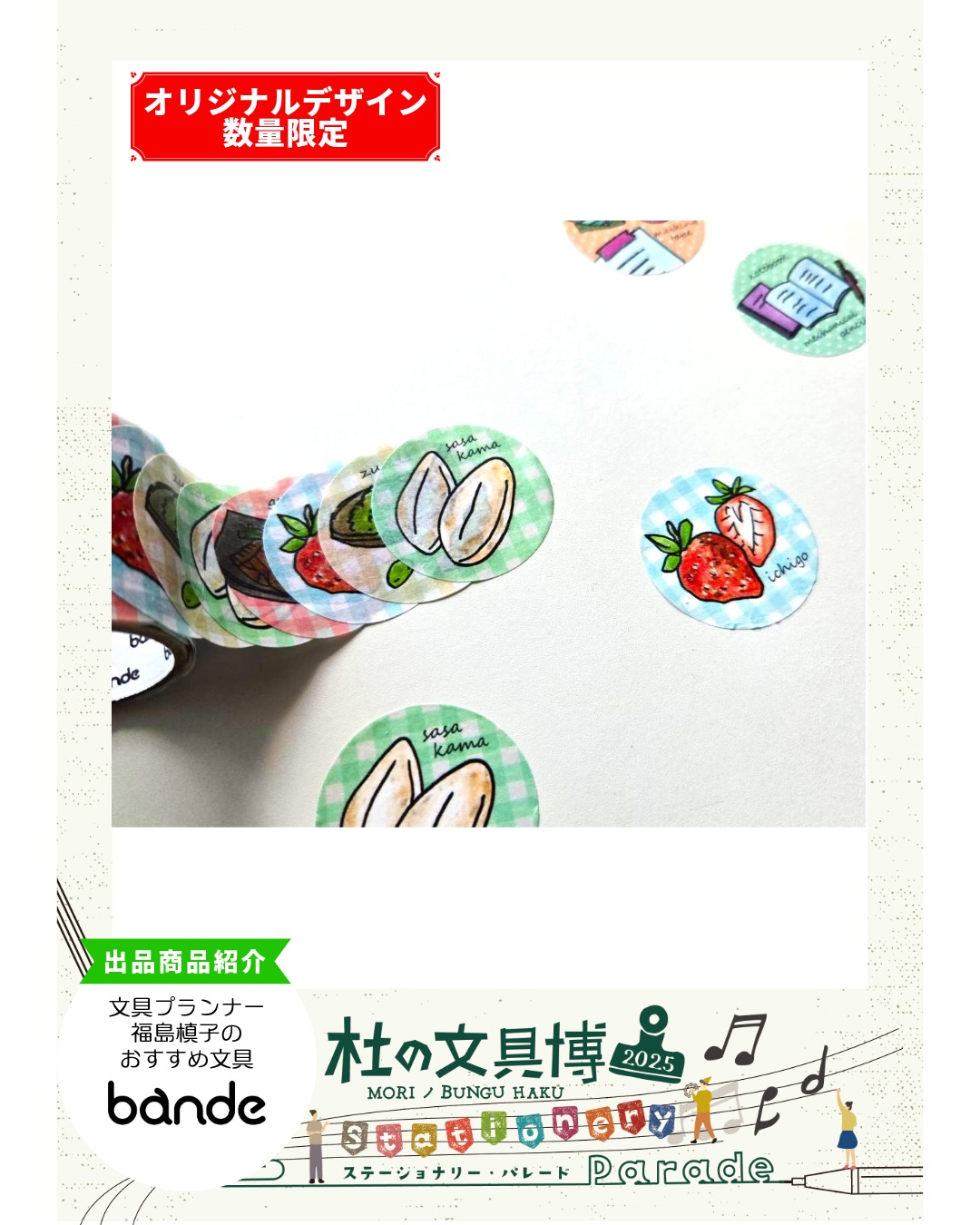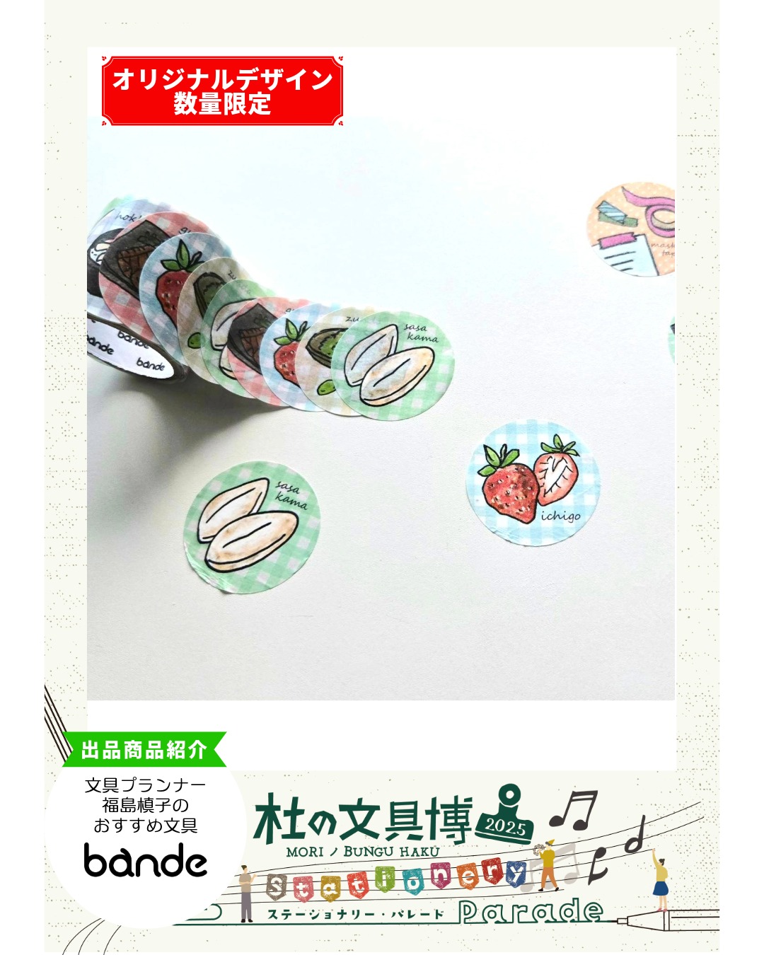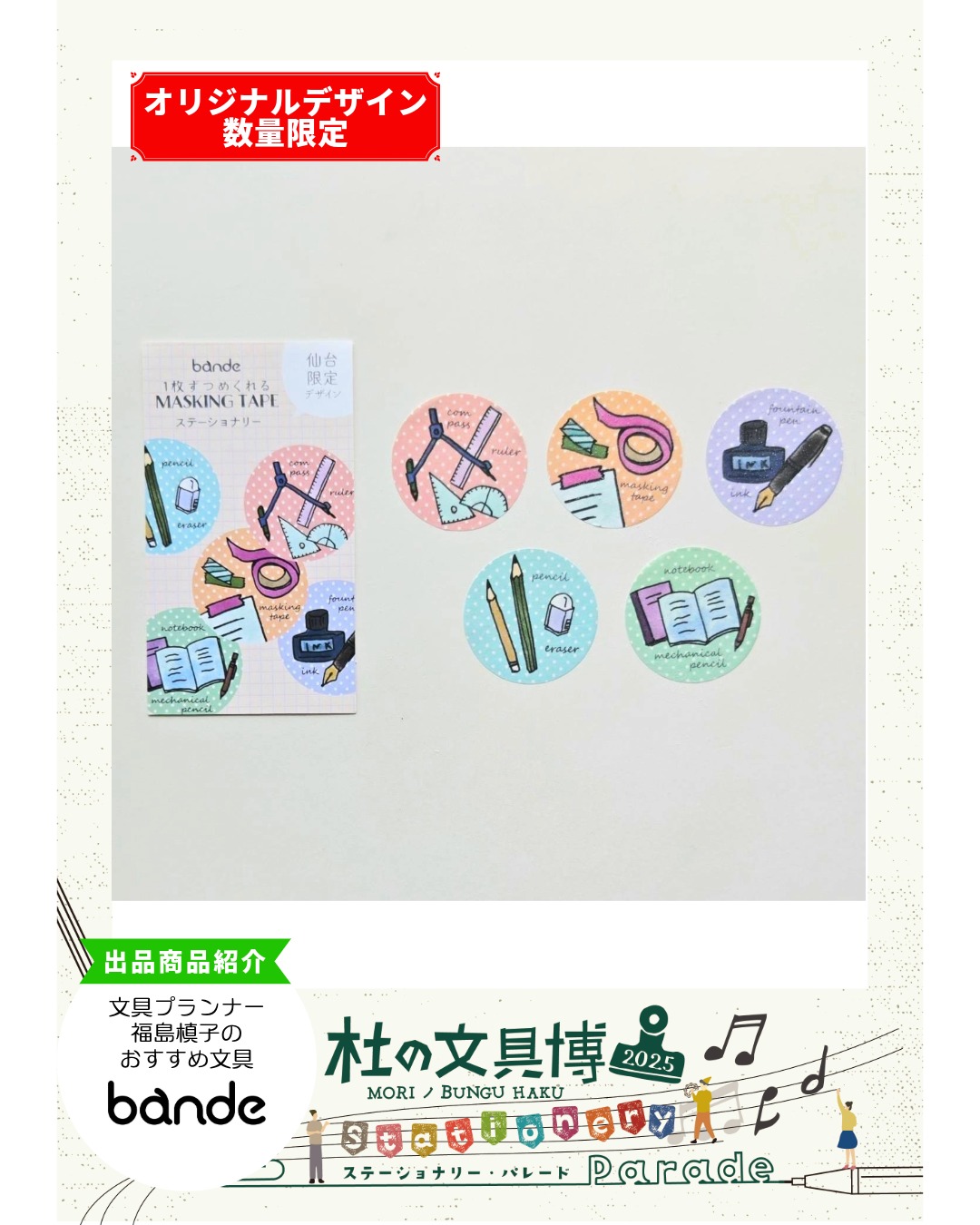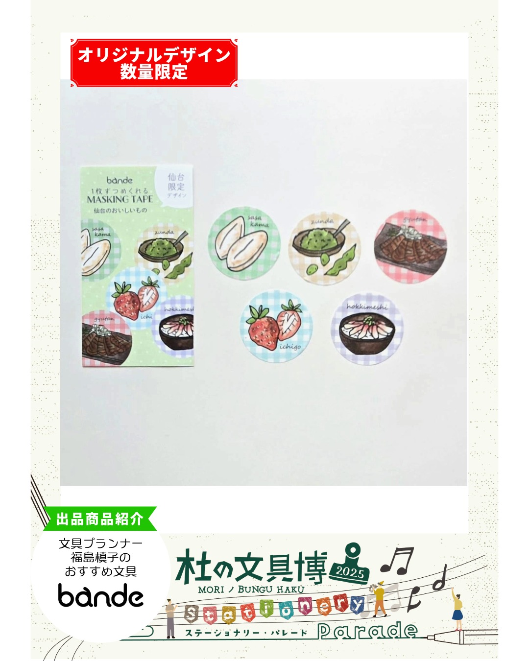 人気の1枚ずつはがせるマスキングロールステッカー「bande」を仙台のおいしい食べ物イラストと文房具のイラストで作りました。食べ物は笹かま、牛タン、ずんだ、ほっきめし、仙台いちごの5柄です。